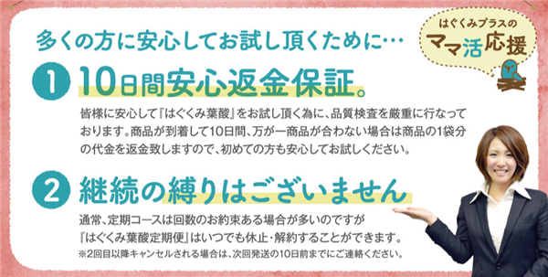 はぐくみ葉酸サプリ定期コースは10日間の全額返金保証がついています。